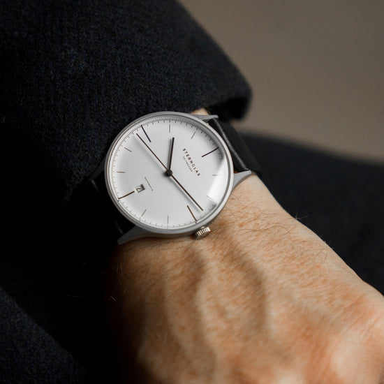 popup|Ultraflach und zurückhaltend|Inspiriert von der Bauhaus-Bewegung ist das Zifferblatt reduziert und klar gehalten. Feine Details, wie die konkave Wölbung, geben dem Modell aber dennoch einen eigenständigen Charakter.