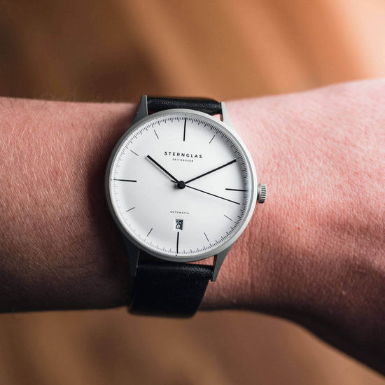 Inspiriert von der Bauhaus-Bewegung ist das Zifferblatt reduziert und klar gehalten. Feine Details, wie die konkave Wölbung, geben dem Modell aber dennoch einen eigenständigen Charakter.