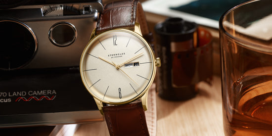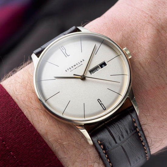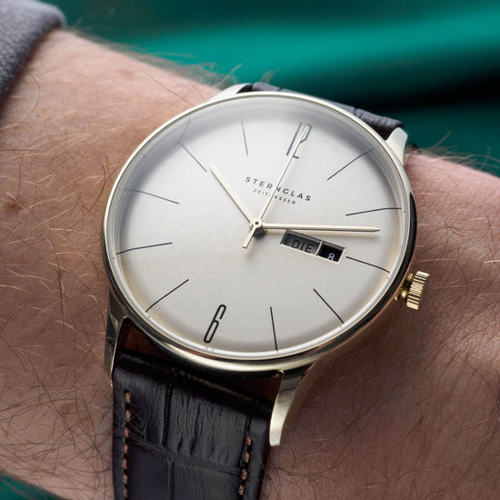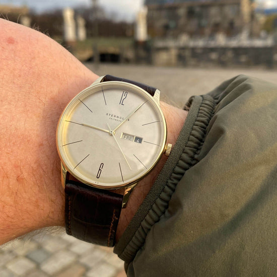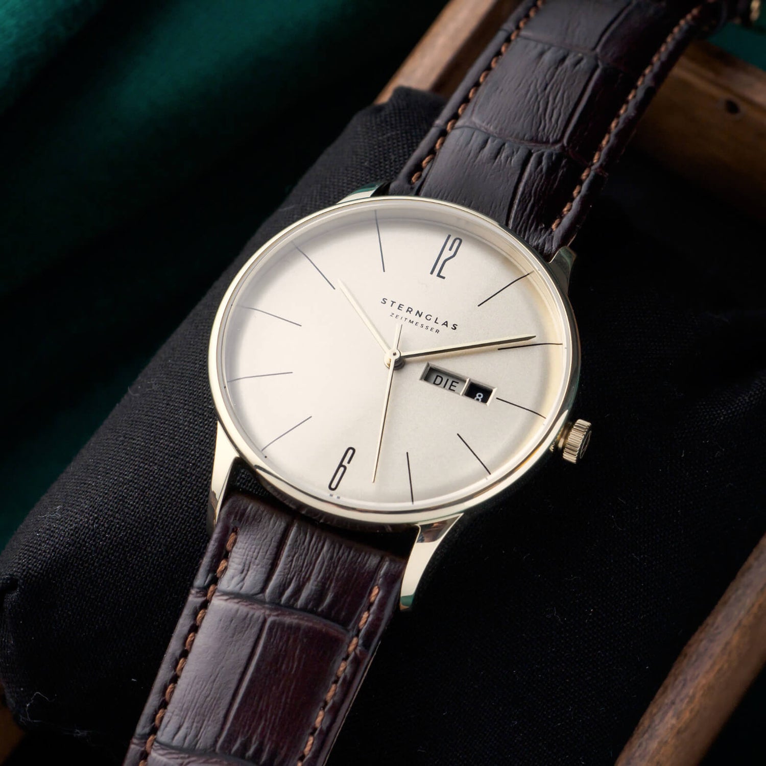 Dieses Gefühl des Wunders wollten wir einfangen und mit der Gemächlichkeit eines anderen Jahrhunderts verbinden. Herausgekommen ist dabei das Modell Berlin mit Wochentags- und Datumsanzeige. Das 38 mm große, champagner-goldenen Gehäuse und das Armband mit Aligatorenprägung unterstreichen den Vintage Stil des Zeitmessers. Zusammen mit einer Gehäusehöhe von 8 mm trägt sich die Berlin angenehm am Handgelenk und kombiniert den zeitlosen Stil mit minimalistischem Design.