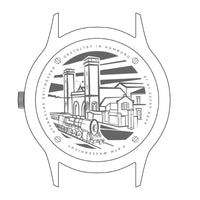 Die Unterseite des 10 mm hohen Gehäuses ziert eine Gravur des Berliner Bahnhofs in unserer Heimatstadt Hamburg. Nach seinem Bau 1857 stellte er für 46 Jahre die westlichste Endhaltestelle dieser Bahnverbindung dar und ermöglichte damals das "schnelle" Reisen von Hamburg nach Berlin in 9 Stunden.