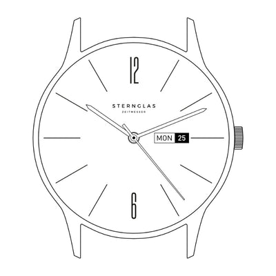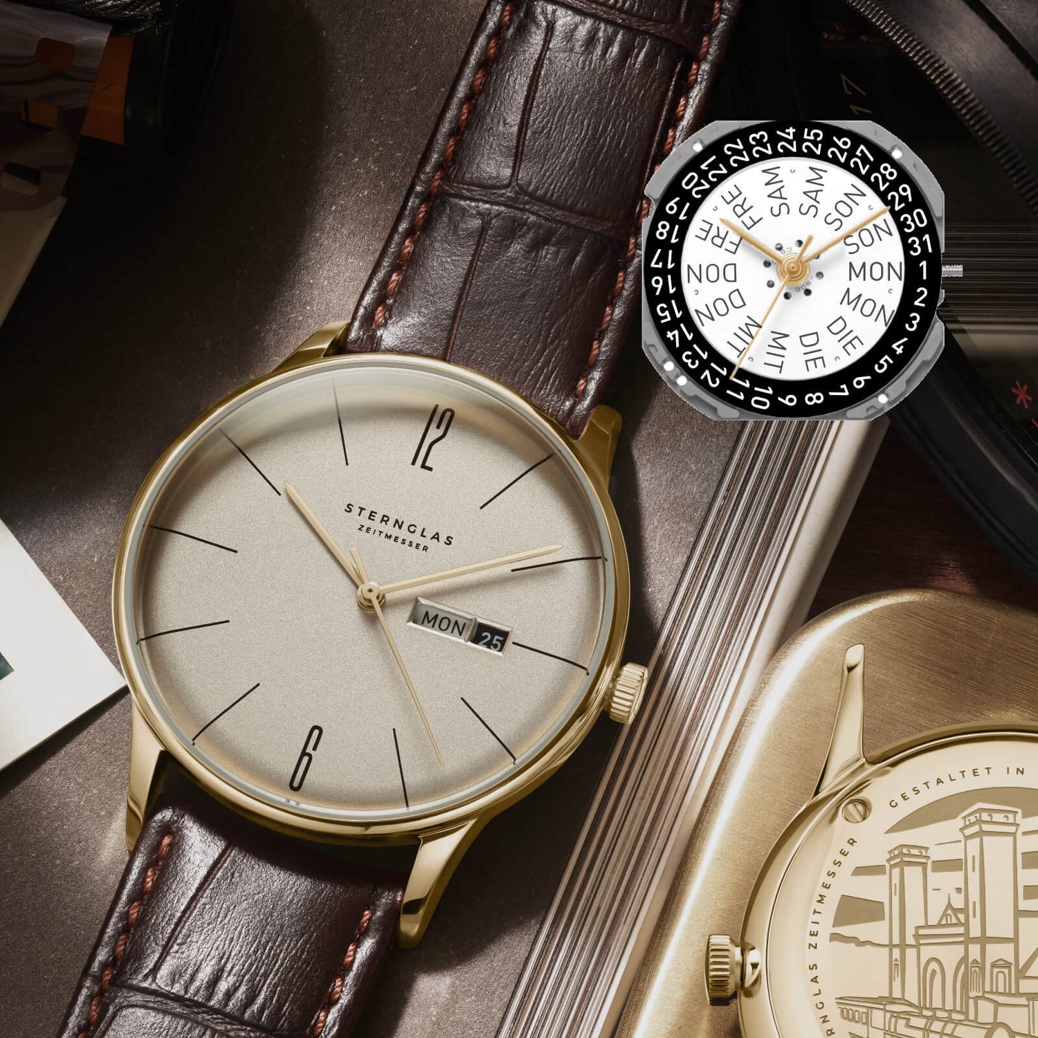 Das Miyota GM02 Quarz-Uhrwerk in diesem Modell bietet eine Wochen- und Datumsanzeige, die wahlweise in Deutsch oder Englisch dargestellt werden kann und sich bequem über die Krone in der ersten Position einstellen lässt.