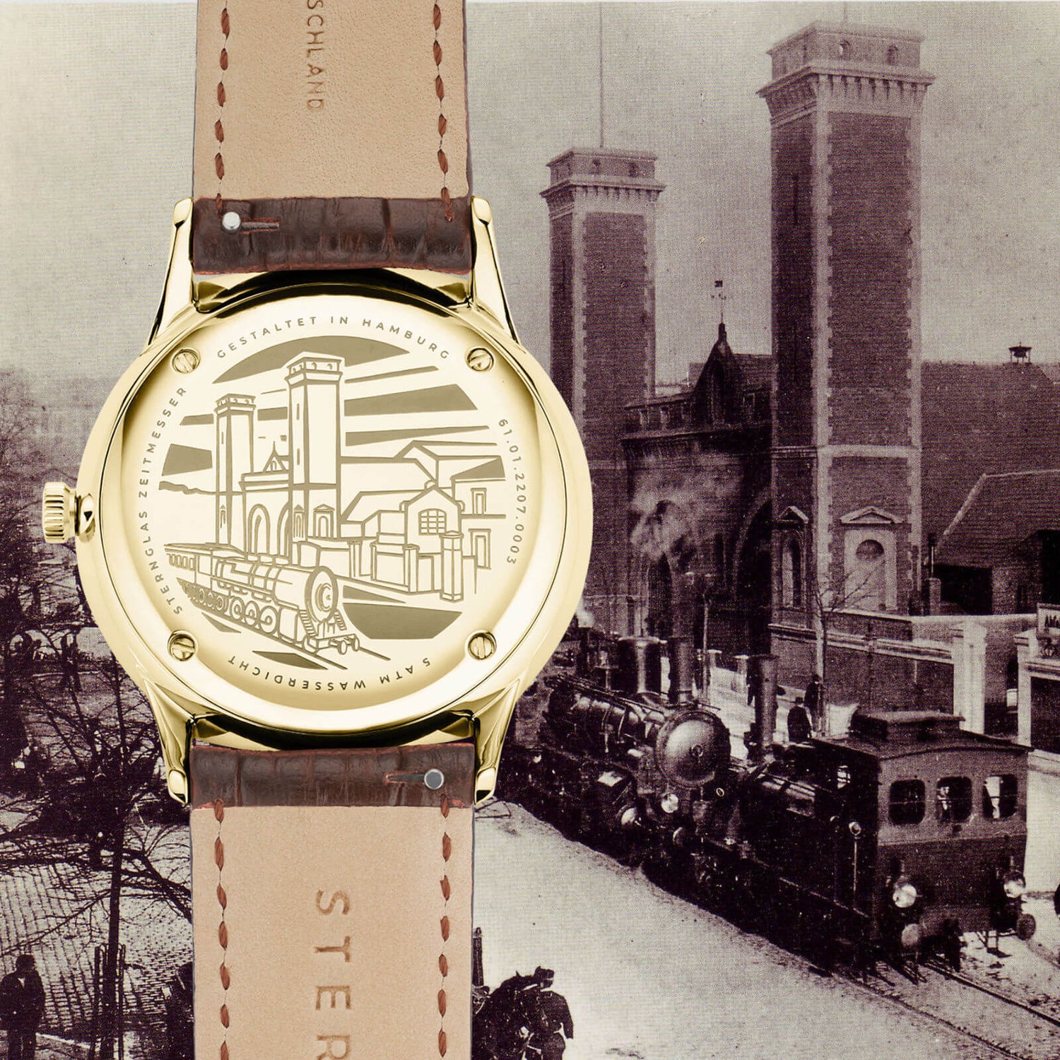 popup|Gravur des namensgebenden "Berliner Bahnhof" | Für eine Wasserdichtigkeit von bis zu 5 ATM sorgt der präzise verschraubte Gehäuseboden mit einer Gravur des Berliner Bahnhofs. Nach seinem Bau 1857 stellte er für 46 Jahre die westlichste Endhaltestelle der Bahnverbindung zwischen Hamburg und Berlin dar.