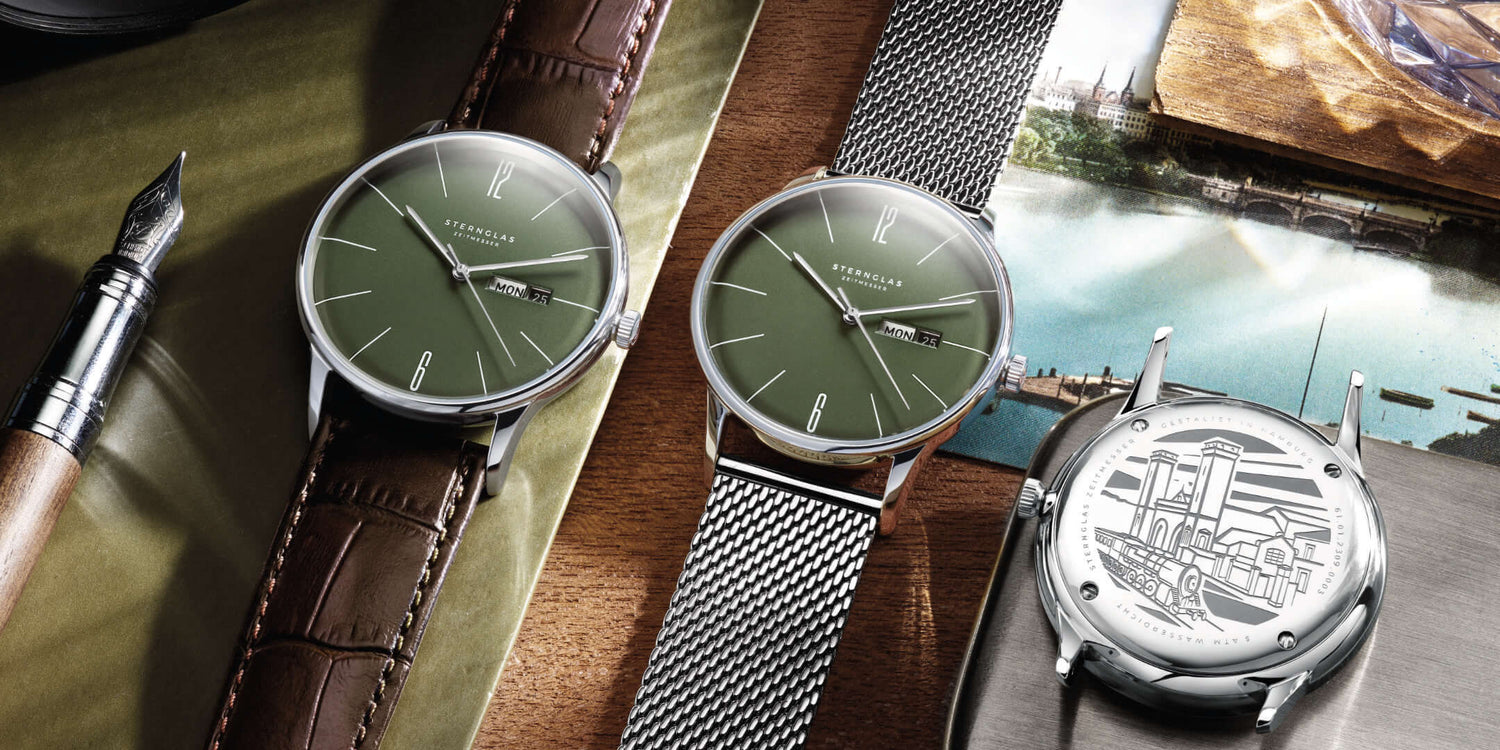 Inspiriert vom Berliner Bahnhof im Hamburg der 1850er Jahre. Das olivgrünfarbene, gewölbte Zifferblatt gemeinsam mit der Wochentagsanzeige und dem kratzfestes Saphirglas machen die Berlin bereit für das 21. Jahrhundert.
