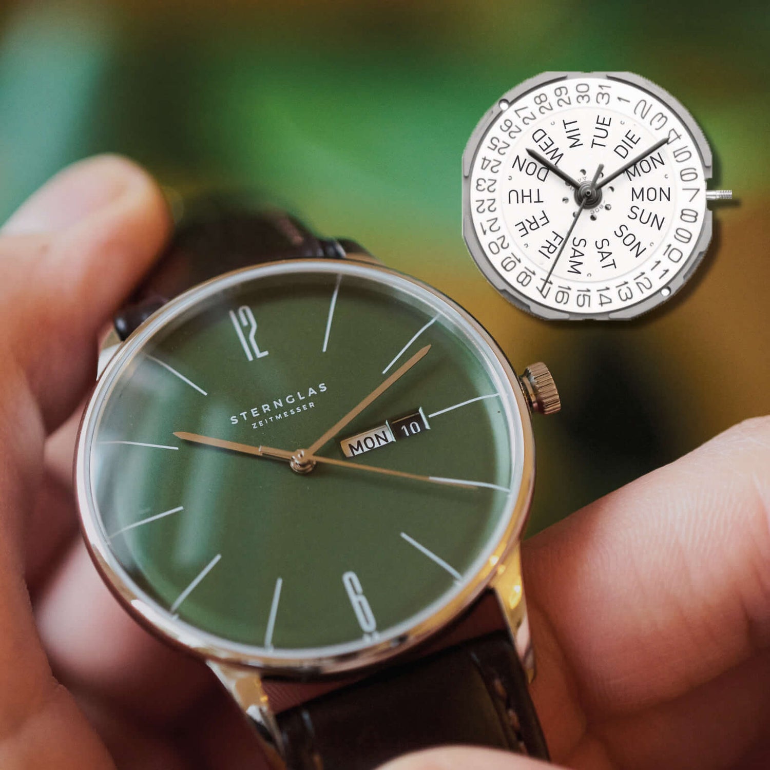 Das Miyota GM02 Quarz-Uhrwerk in diesem Modell bietet eine Wochen- und Datumsanzeige, die wahlweise in Deutsch oder Englisch dargestellt werden kann und sich bequem über die Krone in der ersten Position einstellen lässt.