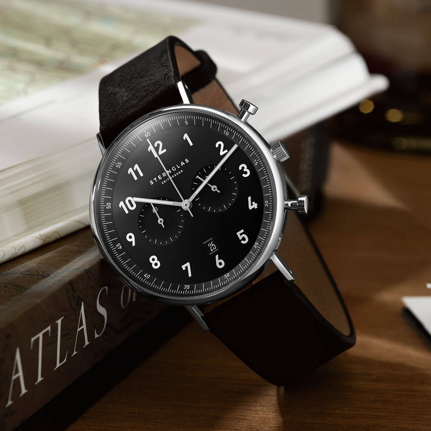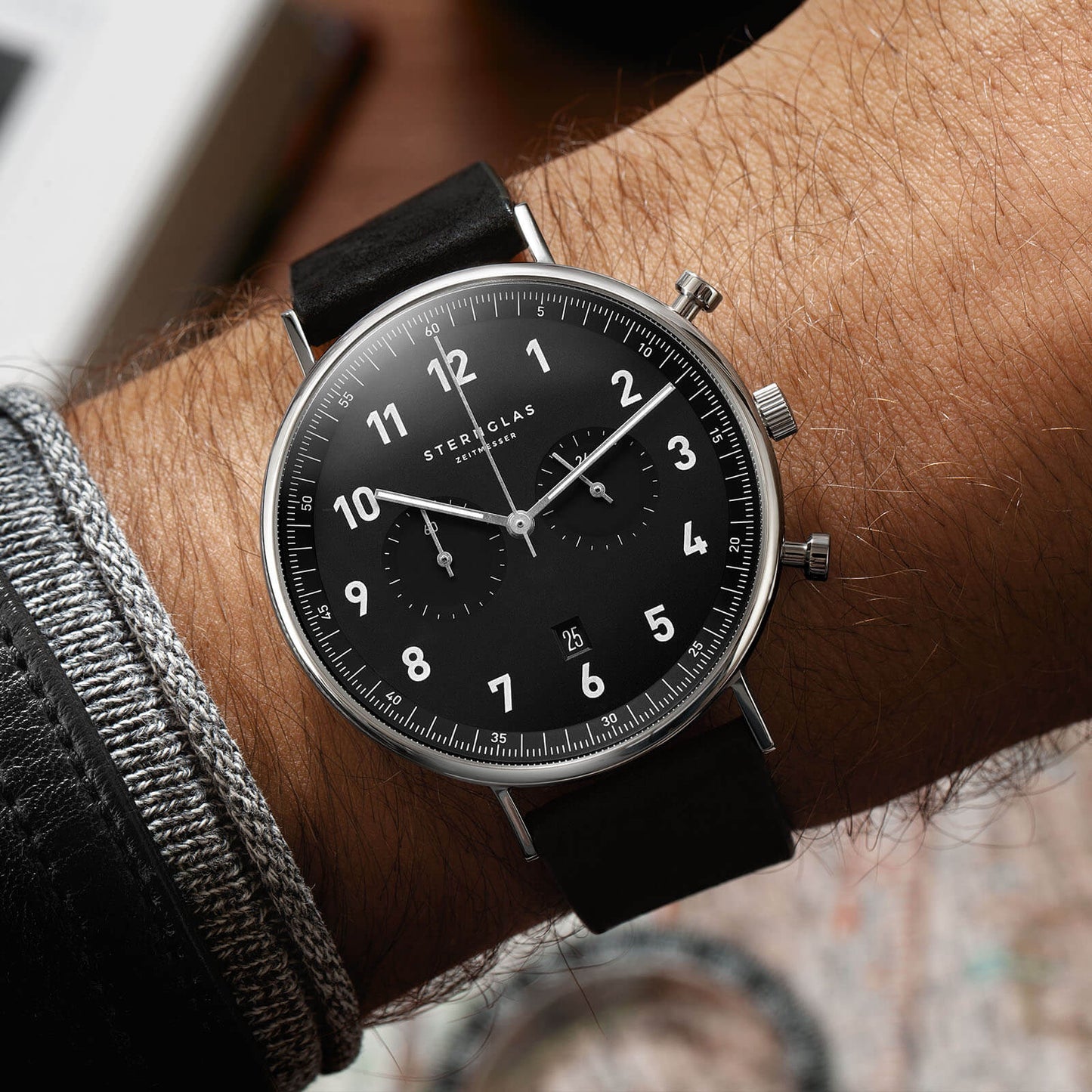 popup|Große Ziffern sorgen für eine optimale Ablesbarkeit|Wir stellen vor: der STERNGLAS Chrono. Bei Betätigung des Drückers zum Auslösen der Stopp-Funktion können bis zu 59 Minuten und 59 Sekunden gemessen werden, der Chronograph-Sekundenzeiger auf dem Hauptzierblatt zeigt Dir dabei die exakten Sekunden an.