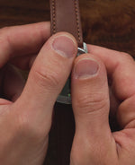 3 — Lege ein neues Band an, indem Du den Pin erneut nach innen schiebst und den Federsteg nacheinander in die Löcher im Gehäuse führst.