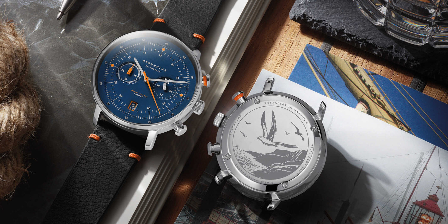 Die Hamburg endlich auch als Chronograph mit Mecha-Quartz Uhrwerk. Maritimes Design mit fließendem Stoppuhrzeiger, Luminova und einer aufregenden Gravur auf der Rückseite.
