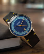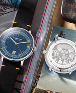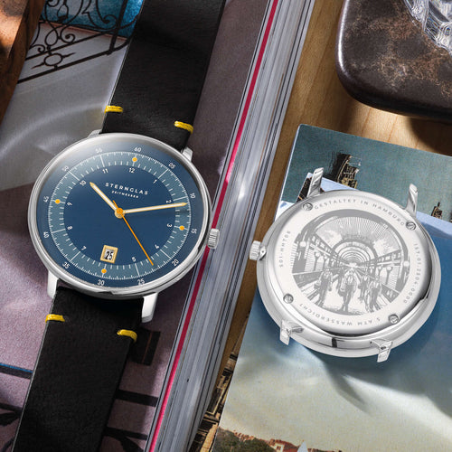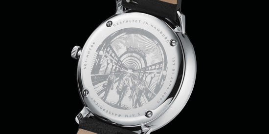 Seit 1911 verbindet der Alte Elbtunnel Hamburgs Ufer. Tiefblaues Zifferblatt, golden schimmernde Akzente und Signalorange erinnern an sein maritimes Erbe. Eine kunstvolle Gravur macht die Hamburg Edition 1911 zu einem Zeitmesser mit Geschichte.