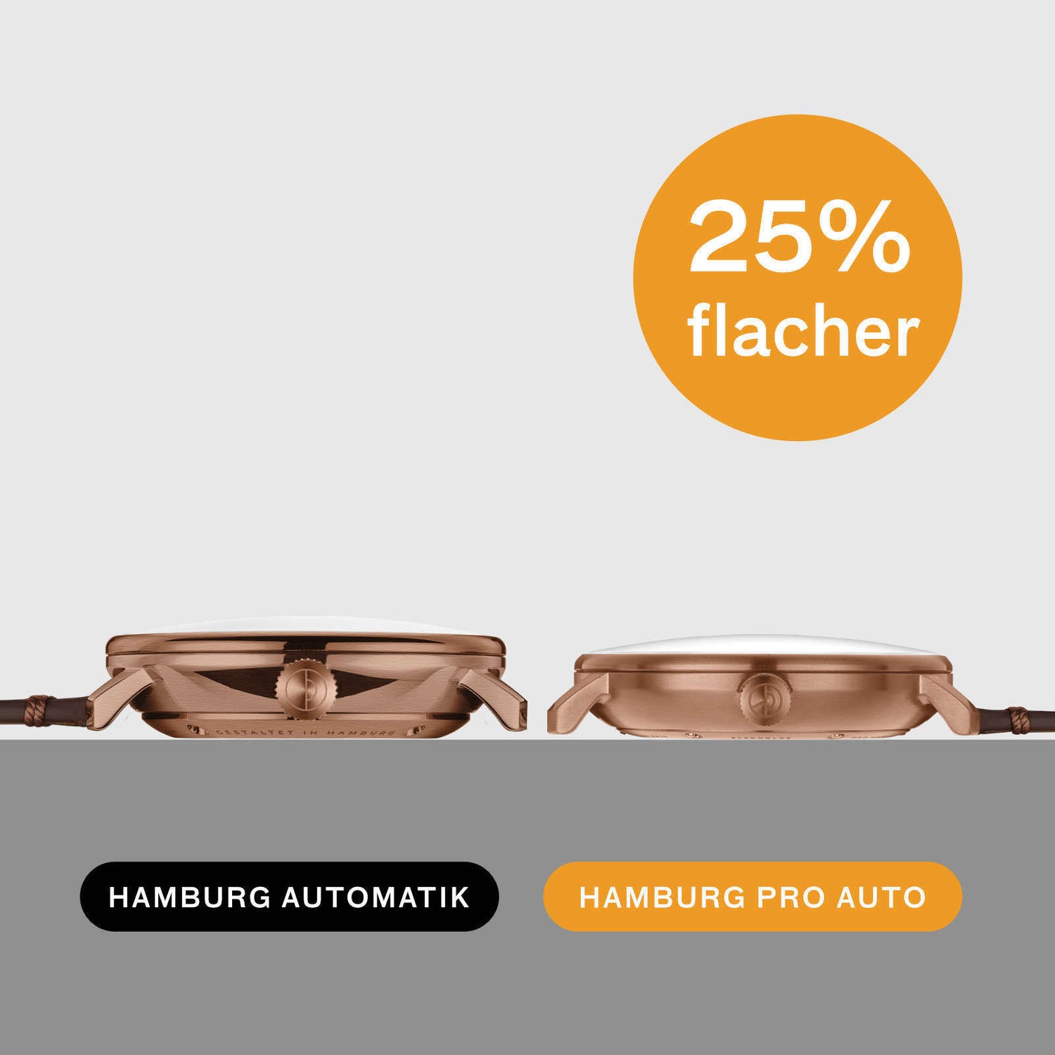 Die Hamburg Pro Automatik ist 25% flacher und eleganter, trägt sich noch komfortabler und begeistert mit einem präzisen Premium-Automatikwerk. Unser Klassiker in Bestform.