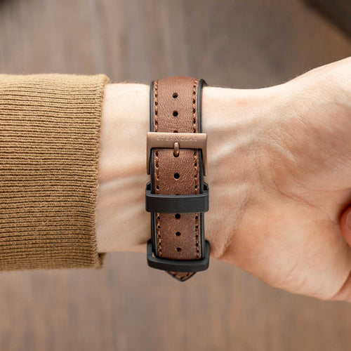 Auf der Oberseite sorgt echtes Leder für eine klassische, hochwertige Optik. Das Leder wird fest mit dem Silikon verbunden und zusätzlich vernäht. So bleibt das Armband formstabil und widerstandsfähig, auch bei häufigem Tragen.