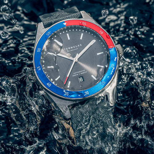 | Besonderheiten | Drehbare Aluminium-Lünette, verschraubte Krone |