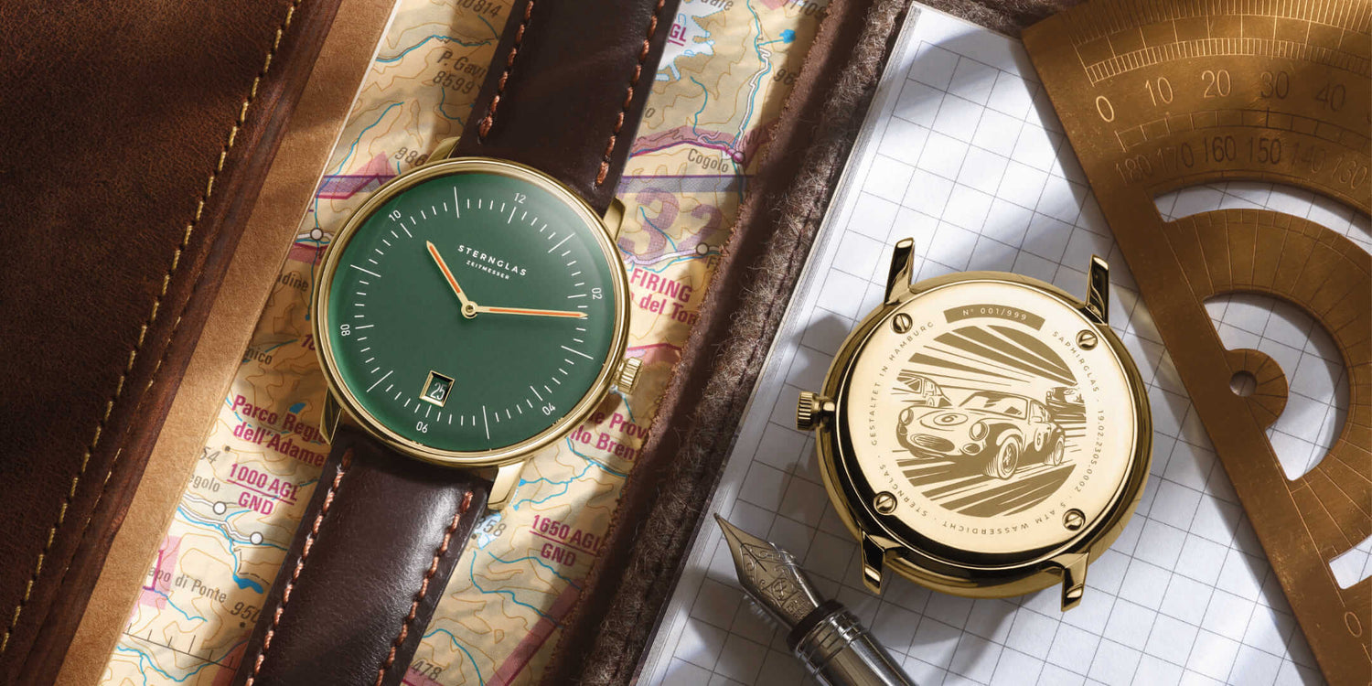 Die auf 999 Exemplare limitierte Naos Edition Cambridge ist eine Hommage an die Goldenen Zwanziger. Das goldfarbene Edelstahlgehäuse sowie das Zifferblatt in British Racing Green runden zusammen mit dem gravierten Gehäuseboden die Vintage Optik ab.