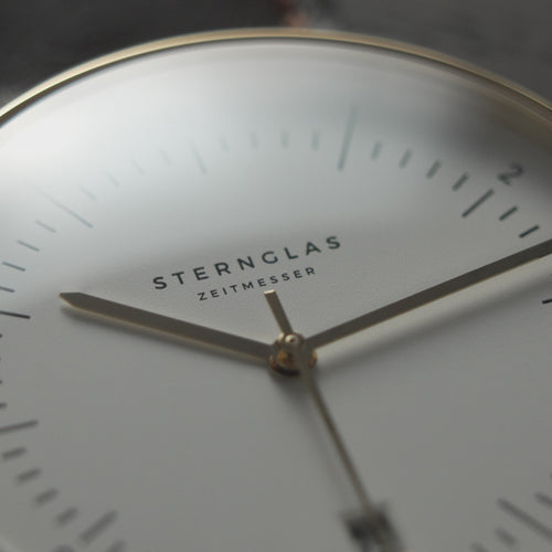 Eleganter Goldton trifft markantes Zifferblatt in Weiß. Mit detailgenauer Gravur auf der Rückseite. Zeitlos, präzise und gemacht für Entdecker.