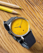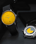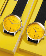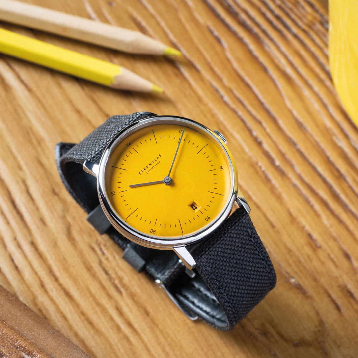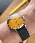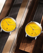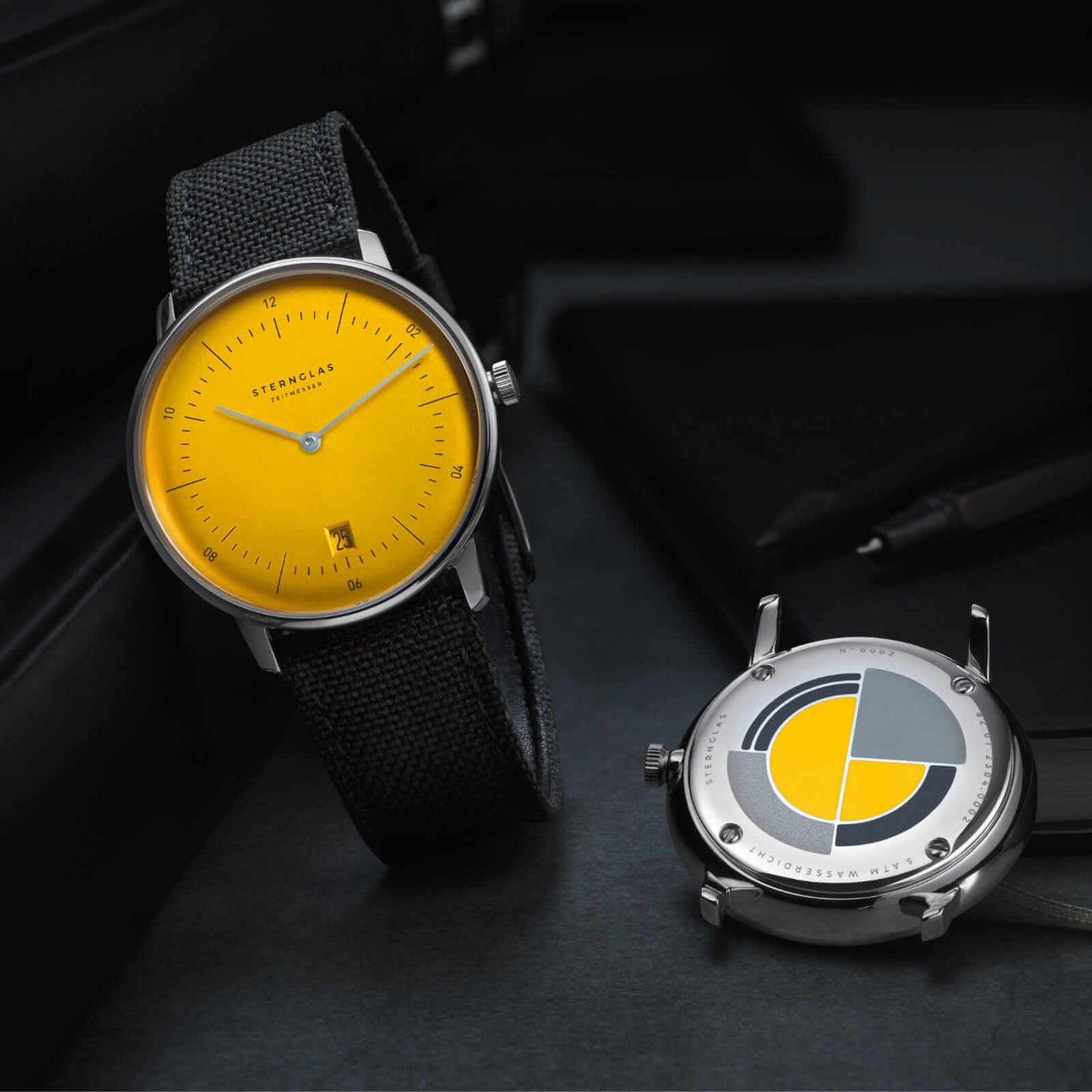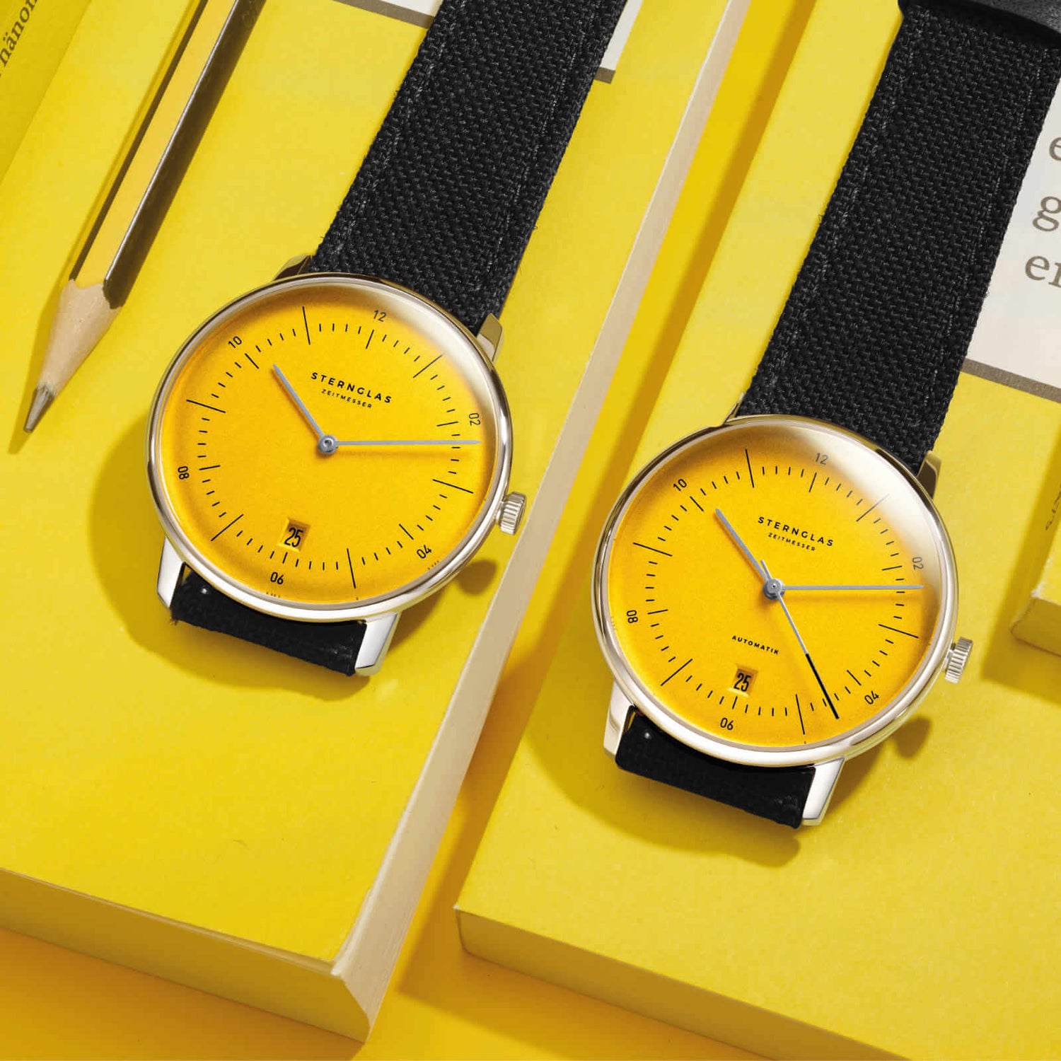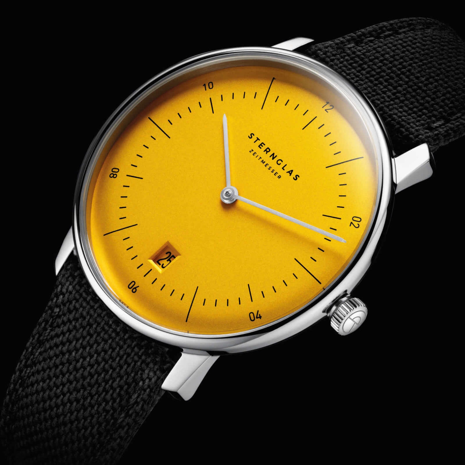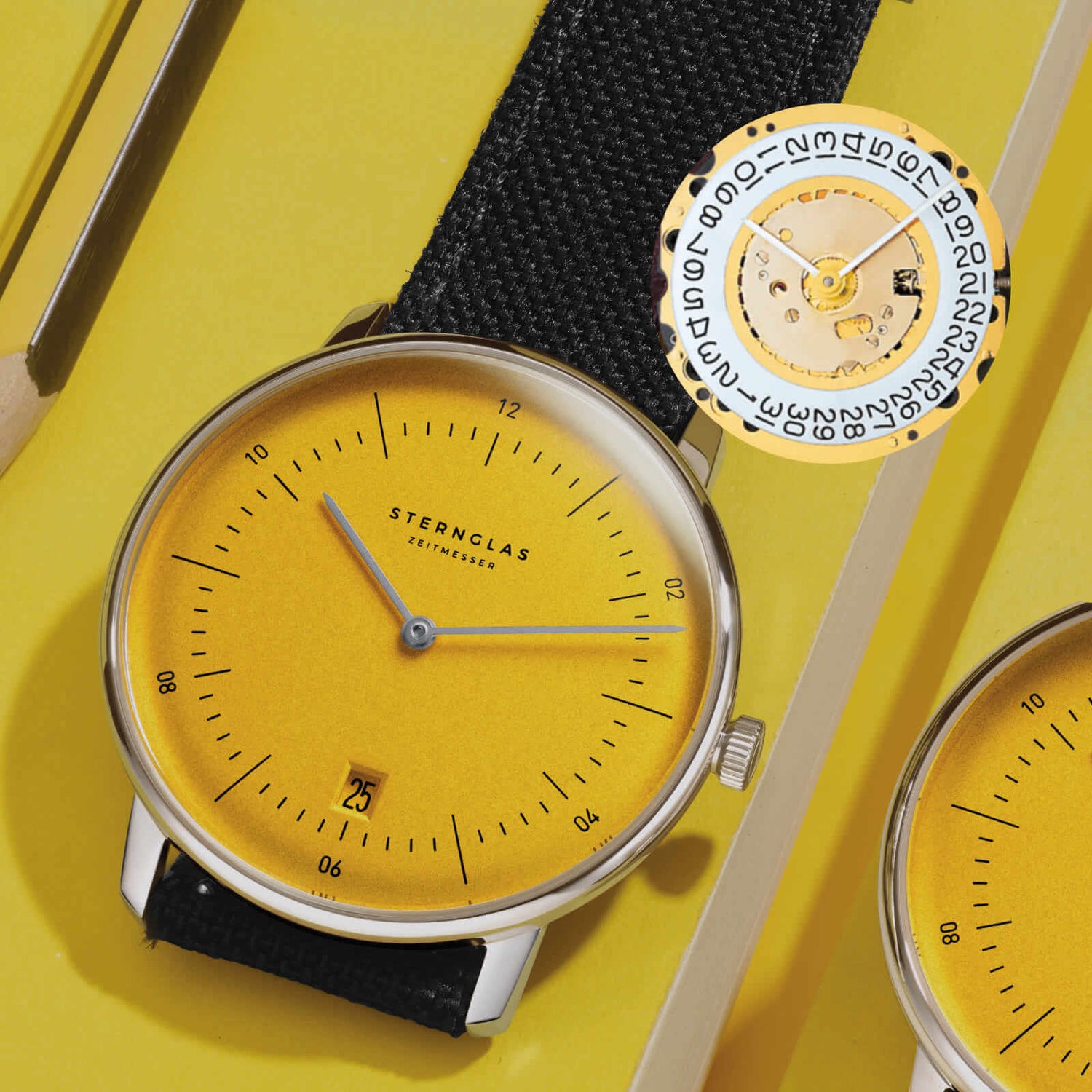 | Zifferblatt | gelb, satiniert, gewölbt |