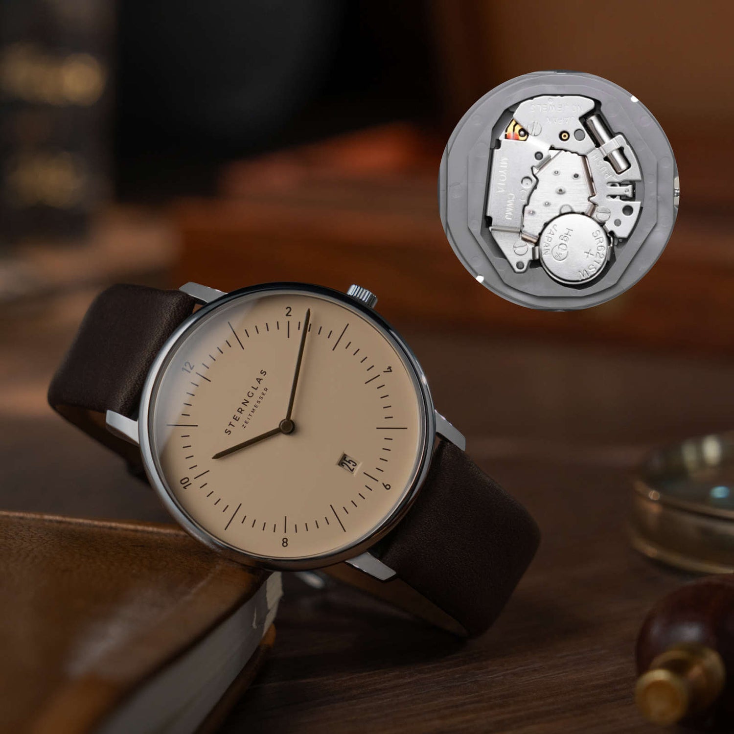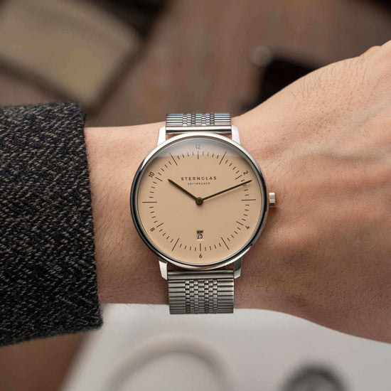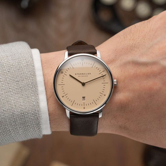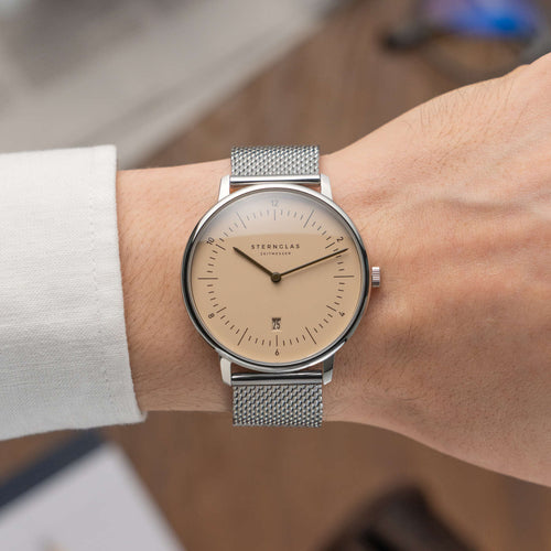 Der stilvolle STERNGLAS Klassiker im minimalistischen Bauhaus-Design. Von geschäftlich bis lässig, von Arbeit bis Freizeit, dieser Zeitmesser passt immer und unter jeden Hemdsärmel.