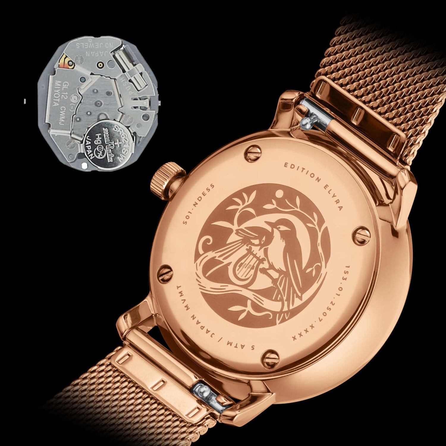 Auf der Rückseite der Naos XS Edition Elyra verbirgt sich ein kunstvolles Detail: Zwei Elstern mit einer Harfe zieren die Gravur und verweisen auf die Lyra der griechischen Mythologie, das Sinnbild für Harmonie und Klang.